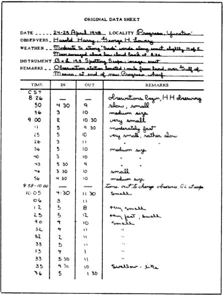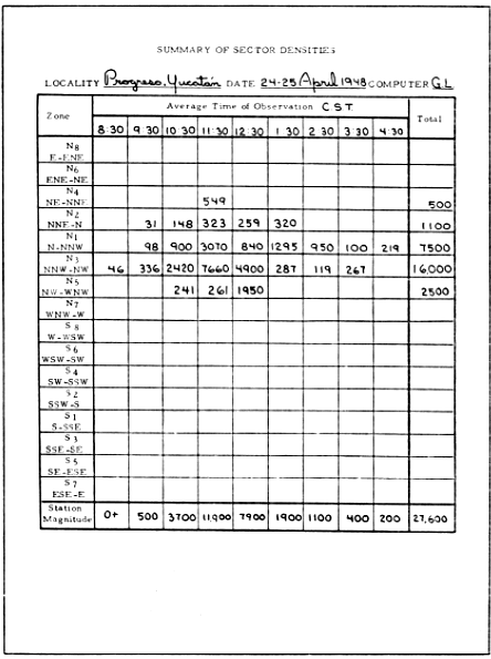 The recording of the original field data in the spring of 1948 from the thirty-odd stations in North America involved the participation of more than 200 ornithologists and astronomers. This collaboration attests to the splendid cooperative spirit that exists among scientists. Many of these persons stayed at the telescope, either as observer or as recorder, hours on end in order to get sets of data extending through a whole night.