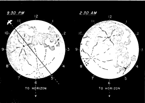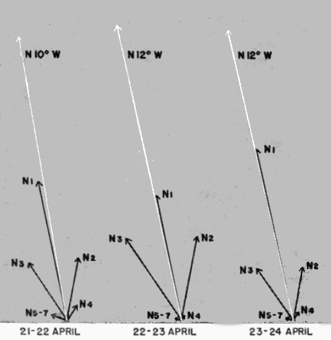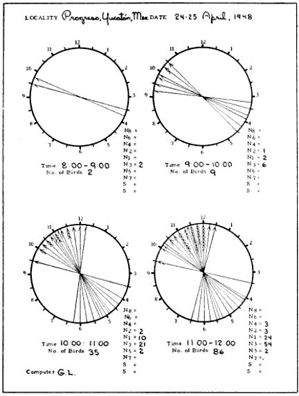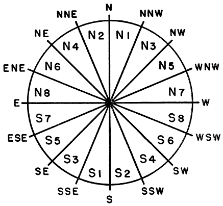 [Pg_384] Since individually computed directions are not very reliable in any event, little is to be lost by treating the observed pathways in groups. Consequently, the courses of all the birds seen in a one-hour period may be computed according to the position of the moon at the middle of the interval and expressed in terms of their general positions on the compass, rather than their exact headings. For this latter purpose, the compass has been divided into twelve fixed sectors, 22½ degrees wide. The trends of the flight paths are identified by the mid-direction of the sector into which they fall. The sectoring method is described in detail in the section on procedures.