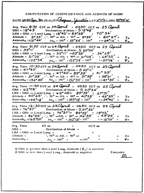 Essential materials and equipment include: (1) a small telescope; (2) a tripod with pan-tilt or turret head and a mounting cradle; (3) data sheets similar to the one illustrated in Figure 12. Bausch and Lomb or Argus spotting scopes (19.5 ×) and astronomical telescopes up to 30- or 40-power are ideal. Instruments of higher magnification are subject to vibration, unless very firmly mounted, and lead to difficulties in following the progress of the moon, unless powered by clockwork. Cradles usually have to be devised. An [Pg_391] adjustable lawn chair is an important factor in comfort in latitudes where the moon reaches a point high overhead.