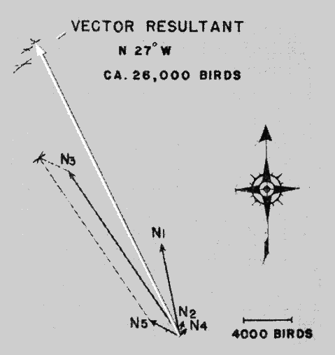 Net Trend Density represents the maximum net flow of migration over a one-mile line. It is found by plotting the sector densities directionally as lines of thrust, proportioned according to the density in each sector, and using vector analysis to obtain a vector resultant, representing the density and direction of the net trend. The mile line defining the spacial limits lies at right angles to this vector resultant, but the density figure includes all of the birds crossing the line, not just those that do so at a specified angle. Much of the directional spread exhibited by sector densities undoubtedly has no basis in reality but results from inaccuracies in coördinate readings and from practical difficulties inherent in the method of computation. By reducing all directions to one major trend, net trend density has the advantage of balancing errors one against the other and may often give the truer index to the way in which the birds are actually going. On the other hand, if the basic directions are too widely spread or if the major sector vectors are widely separated with little or no representation between, the net trend density may become an abstraction, expressing the idea of a mean direction but pointing down an avenue along which no migrants are traveling. In such instances, little of importance can be learned from it. In others, it gives an idea of general trends indispensable in comparing station with station to test the existence of flyways and in mapping the continental distribution of flight on a given night to study the influence of weather factors.