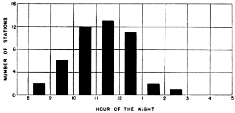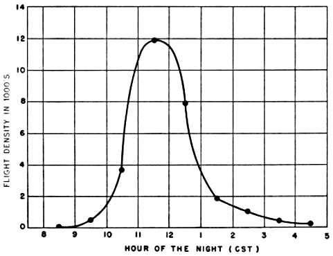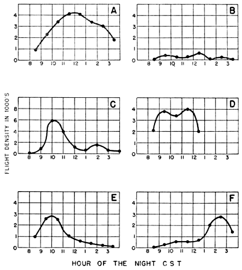 Attention has been drawn already to the nature of the nightly flights at stations immediately inland from the Gulf coast, where densities decline abruptly well before midnight. I have suggested that this early drop-off is mainly a result of the small amount of terrain south of these stations from which birds may be contributed to a night's flight. At Oak Grove, Louisiana, the flight exhibited a strong directional trend with no significant aberrant components. Therefore, one may infer that a considerable part of the flight was derived from regions to the south of the station.