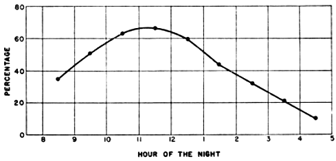 The problem of expressing the number of passing birds in terms of a definite quantity of space is fundamentally one of finding out the critical dimensions of this smaller cone. The diameter at any distance from the observer may be determined with enough accuracy for our purposes simply by multiplying the distance by .009, a convenient approximation of the diameter of the moon, expressed in radians (see Figure 2). One hundred feet away, it is approximately 11 inches; 1000 feet away, nine feet; at one mile, 48 feet; at two miles, 95 feet. Estimating the effective length of the field of observation presents more formidable difficulties, aggravated by the fact that the lunar base of the Great Cone does not remain stationary. The moon rises in the general direction of east and sets somewhere in the west, the exact points where it appears and disappears on the horizon varying somewhat throughout the year. As it drifts across the sky it carries the cone of observation with it like the slim beam of an immense searchlight slowly probing space. This situation is ideal for the purpose of obtaining a random sample of the number of birds flying out in the darkness, yet it involves great complications; for the size of the sample is never at two consecutive instants the same. The nearer the ever-moving great cone of the moon moves toward a vertical position, the nearer its intersection with the flight ceiling approaches the observer, shortening, therefore, the cone of observation (Figure 3). The effect on the number of [Pg_376] birds seen is profound. In extreme instances it may completely reverse the meaning of counts. Under the conditions visualized in Figure 3, the field of observation at midnight is only one-fourth as large as the field of observation earlier in the evening. Thus the twenty-four birds seen from 7 to 8 P. M., represent not twice as many birds actually flying per unit of space as the twelve observed from 11:30 to 12:30 A. M., but only half the amount. Figure 4, based on observations [Pg_377] at Ottumwa, Iowa, on the night of May 22-23, shows a similar effect graphically. Curve A represents the actual numbers of birds per hour seen; Curve B shows the same figures expressed as flight densities, that is, corrected to take into account the changing size of the field of observation. It will be noted that the trends are almost exactly opposite. While A descends, B rises, and vice-versa. In this case, inferences drawn from the unprocessed data lead to a complete misinterpretation of the real situation.