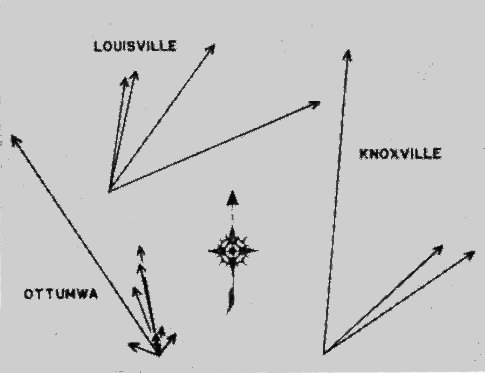 Unfortunately, since there is no way of analyzing the sector trends in terms of the elevations of the birds involved, we have no certain way of deciding whether to compare a given trend with the winds at 2,000, 1,000, or 0 feet. Nor do we know exactly what wind corresponds to the average or median flight level, which would otherwise be a good altitude at which to study the net trend or vector resultant. Furthermore, the Daily Weather Map illustrates conditions that obtained at 12:30 A. M. (CST); the winds aloft are based on observations made at 10:00 P. M. (CST); and the data on birds covers in most cases the better part of the whole night. Add to all this the fact that the flight vectors, their resultants, and the wind representations themselves are all approximations, and it becomes apparent that only the roughest sort of correlations are to be expected.