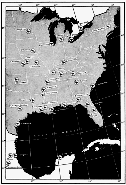 The following were responsible for much of the field data herein used: J. R. Andrews, S. A. Arny, M. Dale Arvey, H. V. Autrey, Charles C. Ayres, Mr. and Mrs. Roy Bailey, Irwin L. Baird, Maurice F. Baker, Rollin H. Baker, Bedortha and Edna Baldwin, Mrs. A. Marguerite Baumgartner, T. A. Becket, Paul Bellington, Donald Bird, Carl Black, Jr., Lea Black, Lytle Blankenship, Mr. and Mrs. J. Stewart Boswell, Bruce Boudreaux, Frank Bray, Mr. and Mrs. Leonard Brecher, Homer Brewer, Mrs. Harvey Broome, Heyward Brown, Floyd Browning, Cyril Broussard, Paul Buress, Ralph M. Burress, Robert Cain, Don Carlos, Mrs. Reba Campbell, Mr. and Mrs. E. Burnham Chamberlain, Laura Chaney, Van B. Chaney, Jr., Edward Clebsch, Mr. and Mrs. Ben B. Coffey, William Cook, Dr. Jack Craven, Hugh C. and William Davis, Katherine Davis, Richard Davis, Richard DeArment, Robert E. Delphia, J. C. Dickinson, Mr. and Mrs. Otto Dietrich, John Dietrich, Clara Dixon, Nina Driven, John J. Duffy, Mr. and Mrs. R. J. Dunbar, Betty Dupre, Bernard E. Eble, Jr., Robert G. Eble, Dr. and Mrs. William H. Elder, C. C. Emory, Davis Emory, Alice H. Farnsworth, James Fielding, William R. Fish, Mr. and Mrs. Myron Ford, W. G. Fuller, Louis Gainey, Dr. Mary E. Gaulden, Mr. and Mrs. John J. Giudice, Lt. L. E. Goodnight, Earl R. Greene, Max Grilkey, W. W. H. Gunn, Noel Maxwell Hall, Jr., A. J. Hanna, Paul Hansen, Harold W. Harry, Joseph Healy, Dorothy Helmer, Mr. and Mrs. John H. Helmer, Philip E. Hoberecht, William D. Hogan, Dr. and Mrs. Joseph C. Howell, E. J. Huggins, Mrs. Walter Huxford, Hugh Iltis, W. S. Jennings, William M. Johnson, William Kasler, Luther F. Keeton, Lawrence C. Kent, W. H. Kiel, L. P. Kindler, Mr. and Mrs. Joseph E. King, Harriet Kirby, E. J. Koestner, Roy Komarek, Ann Knight, Mr. and Mrs. N. B. Langworthy, Mr. and Mrs. C. F. Lard, Prentiss D. Lewis, Ernest Liner, Dr. and Mrs. R. W. Lockwood, Dr. Harvey B. Lovell, William J. Lueck, Don Luethy, James Major, Mr. and Mrs. Russell L. Mannette, Mrs. John B. Mannix, Donald Mary, Dale E. McCollum, Stewart McConnell, Mr. and Mrs. M. L. McCroe, Robert L. McDaniel, Mr. and Mrs. Frank McGill, Thomas Merimer, Mr. and Mrs. I. S. H. Metcalf, Ann Michener, John Michener, T. H. Milby, D. S. Miller, Burt Monroe, Jr., Burt Monroe, Sr., Mrs. R. A. Monroe, Gordon Montague, Duryea Morton, James Mosimonn, Don L. Moyle, Grant Murphy, [Pg_369] John T. Murphy, Mrs. H. F. Murphy, Mrs. Hill Myers, Mr. and Mrs. Robert J. Newman, William Nichols, R. A. Norris, Floyd Oaks, Eugene P. Odum, Mrs. E. E. Overton, Lennie E. Pate, Kenneth Patterson, Ralph Paxton, Louis Peiper, Marie Peiper, Mr. and Mrs. Harold S. Peters, Mary Peters, Mr. and Mrs. D. W. Pfitzer, Betty Plice, Max Plice, Lestar Porter, D. R. Power, Kenneth Price, George Rabb, Marge Reese, Wayne L. Reeve, C. L. Riecke, R. D. Ritchie, V. E. Robinson, Beverly J. Rose, Mary Jane Runyon, Roger Rusk, Bernd Safinsley, Mr. and Mrs. Glen C. Sanderson, Lewis L. Sandidge, John Sather, J. Benton Schaub, Evelyn Schneider, Henry W. Setzer, Mr. and Mrs. Walter Shackleton, Mr. and Mrs. Francis P. Shannon, Mr. and Mrs. Charles Shaw, Paul H. Shepard, Jr., Alan C. Sheppard, Mabel Slack, Alice Smith, R. Demett Smith, Jr., Nat Smith, Major and Mrs. Charles H. Snyder, Albert Springs, Dr. and Mrs. Fred W. Stamm, J. S. Steiner, Mrs. Paul Stephenson, Herbert Stern, Jr., Herbert Stoddard, Mr. and Mrs. F. W. Stomm, Charles Strull, Harold P. Strull, Mrs. Fan B. Tabler, Dr. and Mrs. James T. Tanner, S. M. H. Tate, David Taylor, Hall Tennin, Scott Terry, Mr. and Mrs. S. Charles Thacher, Olive Thomas, G. A. Thompson, Jr., Dr. and Mrs. S. R. Tipton, Robert Tucker, Tom Uzzel, Mr. and Mrs. M. G. Vaiden, Richard Vaught, Edward Violante, Brother I. Vincent, Marilyn L. Walker, Mr. and Mrs. Willis Weaver, Mr. and Mrs. W. L. Webb, Margaret M. L. Wehking, W. A. Welshans, Jr., Mrs. J. F. Wernicke, Francis M. Weston, Miss G. W. Weston, Dr. James W. White, John A. White, A. F. Wicke, Jr., Oren Williams, J. L. Wilson III, W. B. Wilson, Dr. and Mrs. Leonard Wing, Sherry Woo, Rodney Wuthnow, Grace Wyatt, Mr. and Mrs. Malcom Young, Mr. and Mrs. A. J. Zimmerman. To the scores of other people who assisted in making these observations I extend my hearty thanks.