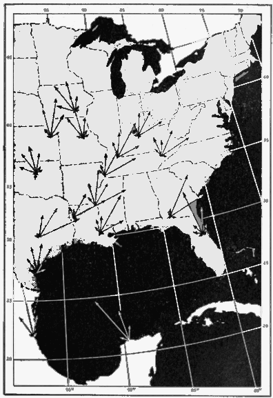 In April and May a high pressure area prevails over the region of the Gulf of Mexico. As the season progresses, fewer and fewer [Pg_458] cold-front storms reach the Gulf area, and as a result the high pressure area over the Gulf is more stable. Since the winds move clockwise around a "high," this gives a general northwesterly trajectory to the air currents in the vicinity of the Yucatán Peninsula. In the western area of the Gulf, the movement of the air mass is in general only slightly west of north, but in the central Gulf states and lower Mississippi Valley the trend is on the average northeasterly. In the eastern part of the Great Plains, however, the average circulation veers again slightly west of north. The over-all vector resultants of bird migration at stations in 1948, as mapped in Figure 39, correspond closely to this general pattern.