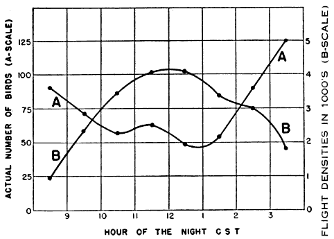 In summary, whether we wish to compare different stations, different hours of the night, or different directions during the same hour of the night, no conclusions regarding even the relative numbers of birds migrating are warranted, unless they take into account the ever-varying dimensions of the field of observation. Otherwise we are attempting to measure migration with a unit that is constantly expanding or contracting. Otherwise we may expect the same kind of meaningless results that we might obtain by combining measurements in millimeters with measurements in inches. Some method must be found by which we can reduce all data to a standard basis for comparison.