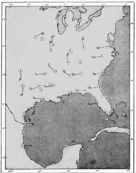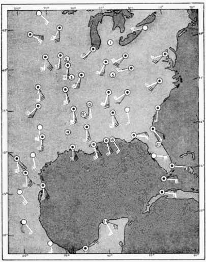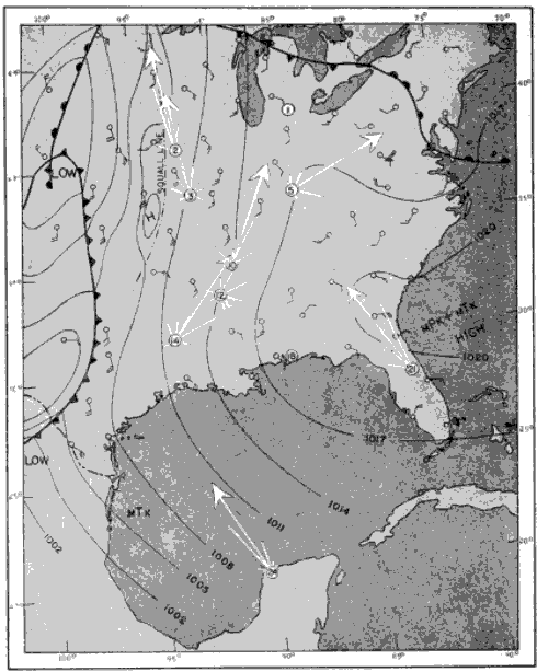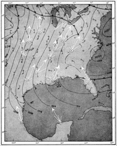 The approach employed has been to plot on maps sector vectors and vector resultants that express the directional trends of migration in the eastern United States and the Gulf region, and to compare the data on these maps with data supplied by the U. S. Weather Bureau regarding the directions and velocities of the winds, the location of high and low pressure areas, the movement of cold and warm fronts, and the disposition of isobars or lines of equal pressure. It should be borne in mind when interpreting these vectors that they are intended to represent the directions of flight only at the proximal ends, or junction points, of the arrows. The tendency of the eye to follow a vector to its distal extremity should not be allowed to create the misapprehension that the actual flight is supposed to have continued on in a straight line to the map location occupied by the arrowhead.
