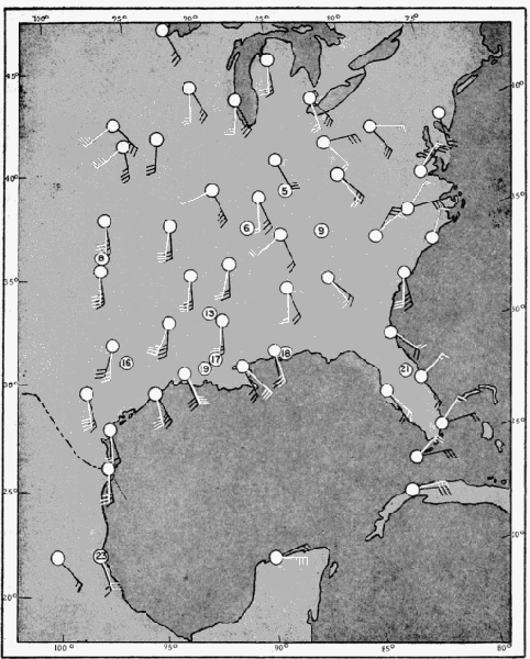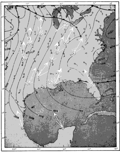 However, as will be seen from a study of the accompanying maps (Figures 40-47), the shifts in wind direction from the surface up to 4,000 feet above sea level are not pronounced in most of the instances [Pg_459] at issue, and such variations as do occur are usually in a clockwise direction. All in all, except for regions where frontal activity is occurring, the weather maps give a workable approximation to the average meteorological conditions on a given night.