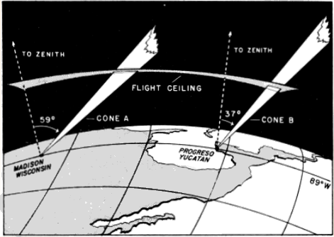 Since the distance from the moon to the earth does not vary a great deal, the full dimensions of the Great Cone determined by the diameter of the moon and a point on the earth remain at all times fairly constant. Just what they are does not concern us here, except as regards the angle of the apex (roughly ½°), because obviously the effective field of observation is limited to that portion of the Great Cone below the maximum ceiling at which birds fly, a much smaller cone, which I shall refer to as the Cone of Observation (Figure 1).