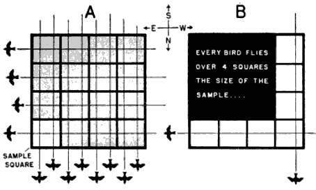 In seeking this end, we must immediately reject the simple logic of sampling that may be applied to density studies of animals on land. We must not assume that, since the field of observation is a volume in space, the number of birds therein can be directly expressed in terms of some standard volume—a cubic mile, let us say. Four birds counted in a cone of observation computed as 1/500 of a cubic mile are not the equivalent of 500 × 4, or 2000, birds per cubic mile. Nor do four birds flying over a sample 1/100 of a square mile mathematically represent 400 birds passing over the square mile. The reason is that we are not dealing with static bodies fixed in space but with moving objects, and the objects that pass through a cubic mile are not the sum of the objects moving through each of its 500 parts. If this fact is not immediately apparent, consider the circumstances in Figures 6 and 7, illustrating the principle as it applies to areas. The relative capacity of the sample and the whole to intercept bodies in motion is more closely expressed by the ratio of their perimeters in the case of areas and the ratio of their surface areas in the case of volumes. But even these ratios lead to inaccurate results [Pg_380] unless the objects are moving in all directions equally (see Figure 8). Since bird migration exhibits strong directional tendencies, I have come to the conclusion that no sampling procedure that can be applied to it is sufficiently reliable short of handling each directional trend separately.