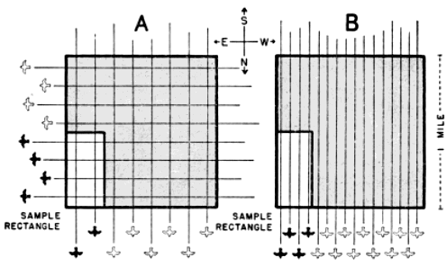 The problem remains of converting the number of birds involved in each directional trend to a fixed standard of measurement. Figure 7A contains the partial elements of a solution. All of the west-east flight paths that cross the large square also cross one of its mile-long sides and suggest the practicability of expressing the amount of migration [Pg_385] in any certain direction in terms of the assumed quantity passing over a one-mile line in a given interval of time. However, many lines of that length can be included within the same set of flight paths (Figure 10); and the number of birds intercepted depends in part upon the orientation of the line. The 90° line is the only one that fully measures the amount of flight per linear unit of front; and so I have chosen as a standard an imaginary mile on the earth's surface lying at right angles to the direction in which the birds are traveling.