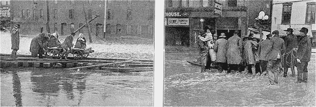 Différente aussi, sinon plus crâne, a été l'attitude, en présence du fléau, des populations. La circulation sur wagonnet, que montre l'une de nos photographies, est à nos yeux nouvelle et assez inattendue. Par ailleurs, il y avait, dans l'aspect des rues sillonnées de barques, assez de ressemblances avec ce que nous vîmes au commencement de 1911, ne serait-ce que la neige qui, succédant aux ondées, avait couvert les toits; et le froid, dont nous souffrions aussi, dans des conditions pareilles, était tel, nous dit-on, qu'à Columbus (Ohio) on vit des gens transis sur les arbres où ils avaient dû se réfugier en hâte pour fuir la montée des flots, tomber, incapables de résister plus longtemps, et se noyer.