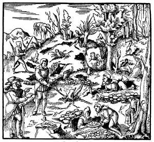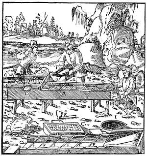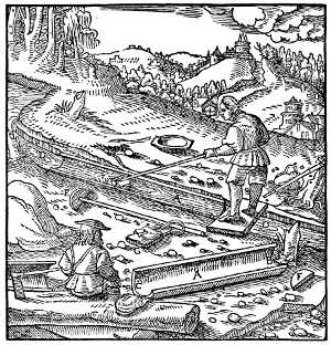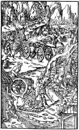 In 1526 Agricola returned to Zwickau, and in 1527 he was chosen town physician at Joachimsthal. This little city in Bohemia is located on the eastern slope of the Erzgebirge, in the midst of the then most prolific metal-mining district of Central Europe. Thence to Freiberg is but fifty miles, and the same radius from that city would include most of the mining towns so frequently mentioned in De Re Metallica—Schneeberg, Geyer, Annaberg and Altenberg—and not far away were Marienberg, Gottesgab, and Platten. Joachimsthal was a booming mining camp, founded but eleven years before Agricola's arrival, and already having several thousand inhabitants. According to Agricola's own statement[4], he spent all the time not required for his medical duties in visiting the mines and smelters, in reading up in the Greek and Latin authors all references to mining, and in association with the most learned among the mining folk. Among these was one Lorenz Berman, whom Agricola afterward set up as the "learned miner" in his dialogue Bermannus. This book was first published by Froben at Basel in 1530, and was a sort of catechism on mineralogy, mining terms, and mining lore. The book was apparently first submitted to the great Erasmus, and the publication arranged by him, a warm letter of approval by him appearing at the beginning of the book[5]. In 1533 he published De Mensuris et Ponderibus, through Froben, this being a discussion of Roman and Greek weights and measures. At about this time he began De Re Metallica—not to be published for twenty-five years.