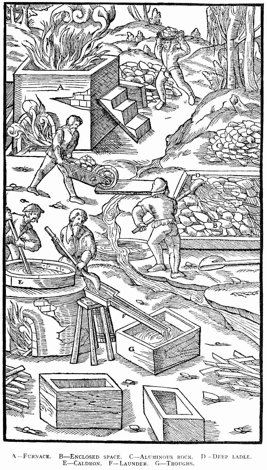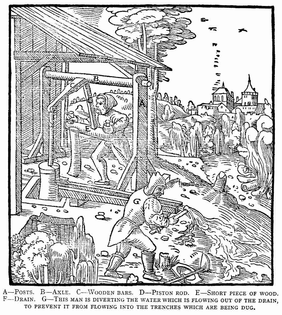 In 1544 began the publication of the series of books to which Agricola owes his position. The first volume comprised five works and was finally issued in 1546; it was subsequently considerably revised, and re-issued in 1558. These works were: De Ortu et Causis Subterraneorum, in five "books," the first work on physical geology; De Natura Eorum quae Effluunt ex Terra, in four "books," on subterranean waters and gases; De Natura Fossilium, in ten "books," the first systematic mineralogy; De Veteribus et Novis Metallis, in two "books," devoted largely to the history of metals and topographical mineralogy; a new edition of Bermannus was included; and finally Rerum Metallicarum Interpretatio, a glossary of Latin and German mineralogical and metallurgical terms. Another work, De Animantibus Subterraneis, usually published with De Re Metallica, is dated 1548 in the preface. It [Pg viii]is devoted to animals which live underground, at least part of the time, but is not a very effective basis of either geologic or zoologic classification. Despite many public activities, Agricola apparently completed De Re Metallica in 1550, but did not send it to the press until 1553; nor did it appear until a year after his death in 1555. But we give further details on the preparation of this work on p. xv. During this period he found time to prepare a small medical work, De Peste, and certain historical studies, details of which appear in the Appendix. There are other works by Agricola referred to by sixteenth century writers, but so far we have not been able to find them although they may exist. Such data as we have, is given in the appendix.