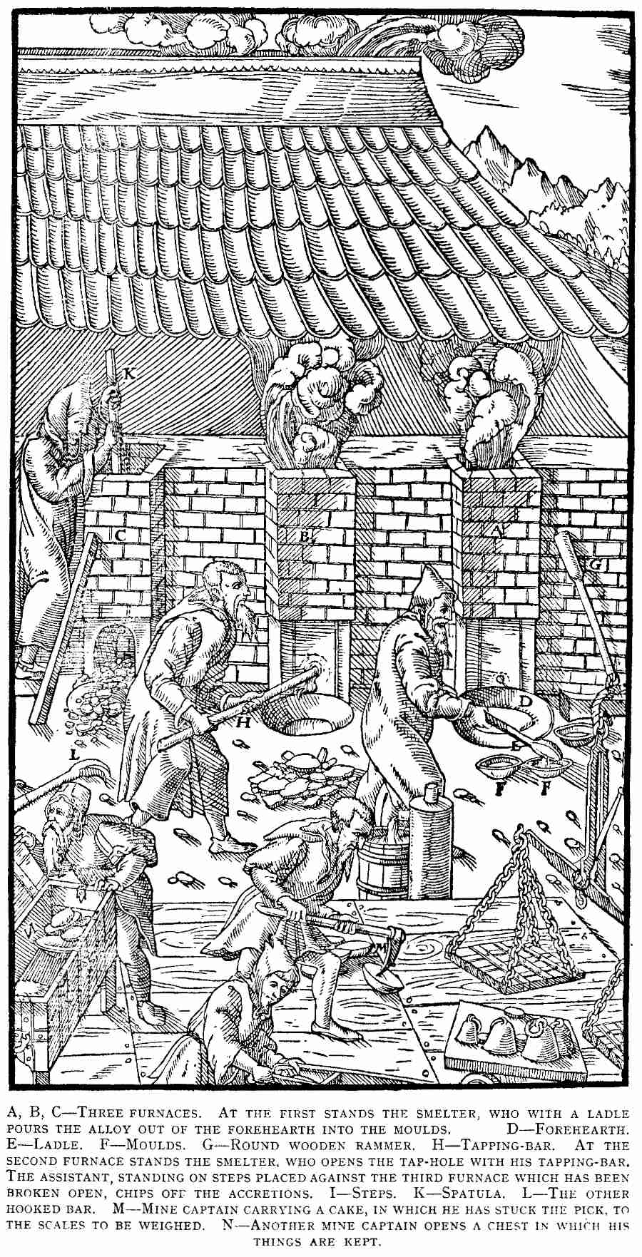 Agricola's Latin, while mostly free from mediæval corruption, is somewhat tainted with German construction. Moreover some portions have not [Pg ii]the continuous flow of sustained thought which others display, but the fact that the writing of the work extended over a period of twenty years, sufficiently explains the considerable variation in style. The technical descriptions in the later books often take the form of House-that-Jack-built sentences which have had to be at least partially broken up and the subject occasionally re-introduced. Ambiguities were also sometimes found which it was necessary to carry on into the translation. Despite these criticisms we must, however, emphasize that Agricola was infinitely clearer in his style than his contemporaries upon such subjects, or for that matter than his successors in almost any language for a couple of centuries. All of the illustrations and display letters of the original have been reproduced and the type as closely approximates to the original as the printers have been able to find in a modern font.