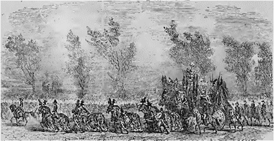 Autour de cortége, les jambes passées dans la carcasse d'un cheval d'osier, galope le maître des cérémonies, le sot de l'ex-corporation des canonniers, appelé Carrocher, du nom du titulaire actuel. Ses vêtements sont ceux des fous en titre d'office. Il court à travers les masses compactes, menace de sa marotte ceux qui ne livrent point passage à la procession, et reçoit des dons volontaires au bénéfice des porteurs. A ce spectacle le peuple bat des mains; c'est toujours avec un nouveau plaisir que les Douaisiens, revoient leur cher Gayant; ils éprouvent pour lui une tendresse inimaginable; la joie que leur cause sa présence va jusqu'à l'attendrissement; la marche de Gayant et leur Ranz, leur Marseillaise locale; l'attente de Gayant les tient en éveil, la présence de Gayant les électrise, le souvenir de Gayant les poursuit. On vit, le 10 juin 1743, une compagnie d'artilleurs douaisiens, campée devant Tournai, déserter tout entière avec armes et bagages. Grande fut l'alarme: le prévôt voulait mettre la maréchaussée en campagne; mais le capitaine. M. de Breande lui dit: «Soyez tranquille, j'sais où ils sont allés; il faut qu'ils voient danser leur grand-père Gayant; mais vous les reverrez, après la kermesse. Et quelque, jours plus tard, la compagnie rentrait au camp, ramenant de Douai bon nombre de nouvelles recrues.