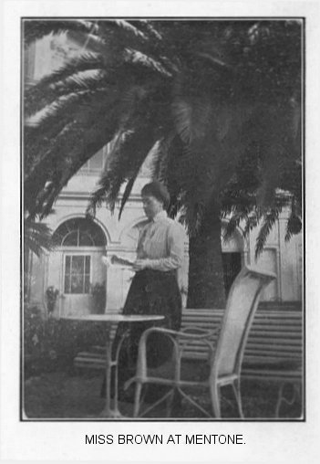 In our hotel we found some interesting people, some of them from England; and those who could speak English were to us, more than usually interesting. We seemed p. 182to be specially drawn toward a lady and gentleman from Southend-on-Sea—a Mr. Brown and Miss Brown, his daughter. She made herself particularly useful and nice to my little wife. We were strangers, and all about us a strange tongue was spoken and new customs in vogue. Miss Brown most kindly offered her aid at any time and on any point that was desired. This was most gratefully accepted, and in a few days we were fast friends. A correspondence has been kept up since we left, so that in all likelihood the friendship formed in Mentone will be continuous and pleasant. We took our walks each morning along the fine promenade in the clear fresh sunshine and bracing sea breeze, so we could feel we were gaining strength and getting a real good bracing up. We took lunch, more than once, at a sweet little Swiss restaurant, everything was scrupulously clean and sweet. We visited the Park Gardens, where the band was every day discoursing sweet music. These gardens are filled on two sides with orange trees; and as we passed them the fruit was just lovely, ripe and ready for plucking. The borders and beds were full of the most beautiful flowers in full bloom. I got two or three snapshots of this pretty place and surroundings.