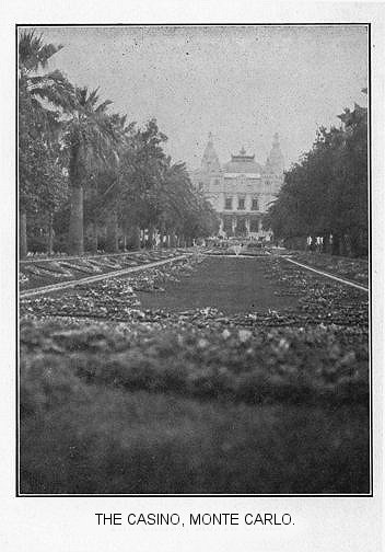 We visited the p. 183cemetery on the hillside. It is difficult to reach, as there are so many steps, but it is well worth a visit. Here are laid to rest the dust of many generations. We found marble monuments in memory of several English residents, who had died in Mentone and were buried here. The graves or mausoleums are carefully kept. Flowers bloom most luxuriantly, and intertwine themselves in and around the sculpture on all sides. Some graves have, built over them, a small tent or room, which is adorned with pictures and filled with flowers. Here the relations of the deceased come, and seem to commune with the departed; at any rate they find some kind of solace in spending a little time near the sacred dust of loved ones. We visited the Market Place, and on market day too, to see the costers from the country in dresses quaint and queer, with their donkeys and carts of the rudest make. One would really have liked to have laughed at their simplicity. The fruit, flowers and vegetables were of a very fine quality; nothing so large in England. New potatoes in January, and new green peas, tomatoes; indeed, everything that our gardens will produce in June, they get here in January. Monte Carlo is only a few miles from Mentone, and there is a tram running; so we determined to pay a visit to p. 184this interesting place before we left the Riviera. A lovely day found us on the tram en route for Monte Carlo. Up the hillsides our tram went, and round some curves that to us seemed dangerous, across some deep ravines, ascending, then descending, for the road is along the rocky mountain side. In about forty minutes we reached this place of notoriety. It is certainly one of the loveliest places under the sun. Someone has said “it is my ideal, in outward appearance, of what heaven will be.” Words are too poor to paint the beauties of Monte Carlo. Some of the places in my native county, Derbyshire, such as “Lovers’ Leap,” “Monsale Dale,” “High Tor,” and others, but on a small and insignificant scale, remind me of the Riviera, only the sea and climate is lacking.