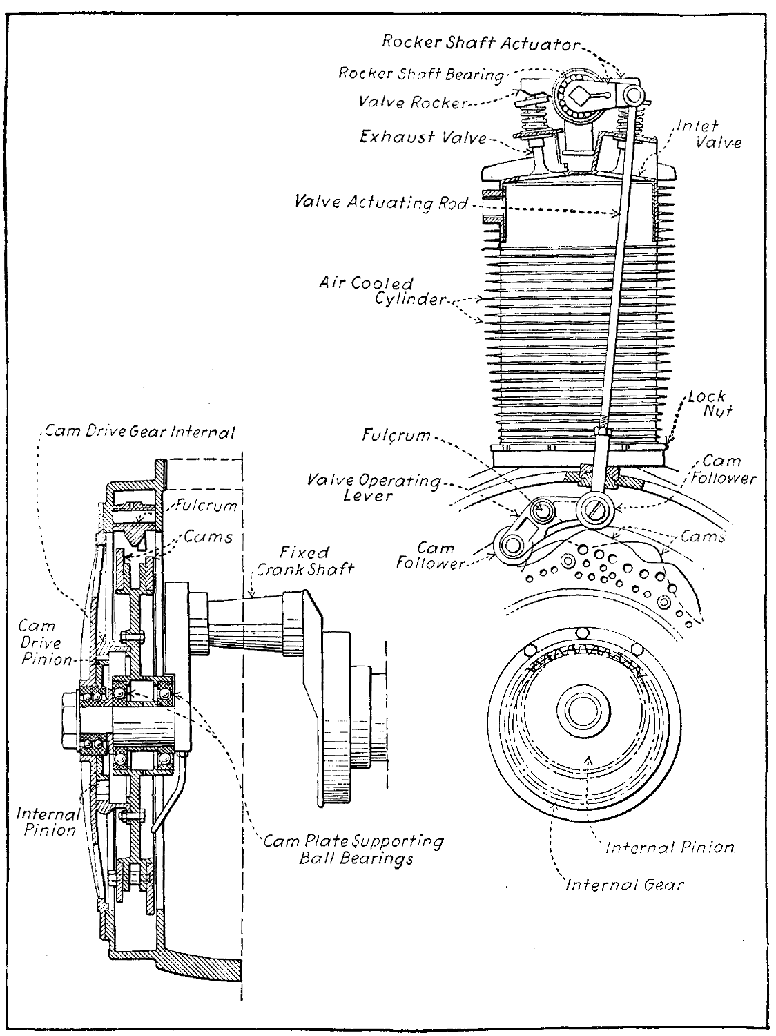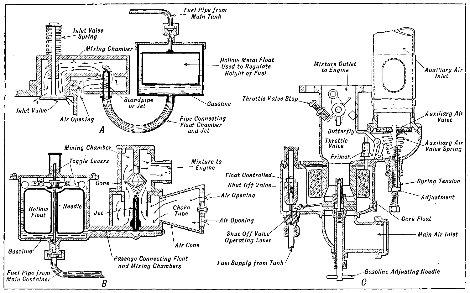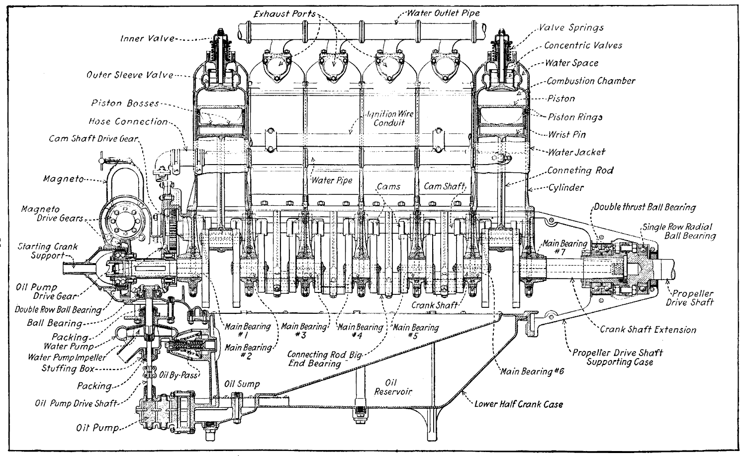 In presenting this treatise on “Aviation Engines,” the writer realizes that the rapidly developing art makes it difficult to outline all latest forms or describe all current engineering practice. This exposition has been prepared primarily for instruction purposes and is adapted for men in the Aviation Section, Signal Corps, and students who wish to become aviators or aviation mechanicians. Every effort has been made to have the engineering information accurate, but owing to the diversity of authorities consulted and use of data translated from foreign language periodicals, it is expected that some slight errors will be present. The writer wishes to acknowledge his indebtedness to such firms as the Curtiss Aeroplane and Motor Co., Hall-Scott Company, Thomas-Morse Aircraft Corporation and General Vehicle Company for photographs and helpful descriptive matter. Special attention has been paid to instructions on tool equipment, use of tools, trouble “shooting” and engine repairs, as it is on these points that the average aviation student is weakest. Only such theoretical consideration of thermo-dynamics as was deemed absolutely necessary to secure a proper understanding of engine action after consulting several instructors is included, the writer’s efforts having been confined to the preparation of a practical series of instructions that would be of the greatest value to those who need a diversified knowledge of internal-combustion engine operation and repair, and[10] who must acquire it quickly. The engines described and illustrated are all practical forms that have been fitted to airplanes capable of making flights and may be considered fairly representative of the present state of the art.