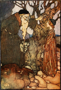 One day she heard some of the maids talking together. They were speaking of the Wise Man, the Magician, who lived in the dark cave on the side of the hill, and could do the most wonderful things. In fact, they said, there was hardly anything he couldn't do; you had only to tell him what you wanted most and he could manage it for you.