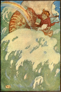 If it had been a fine sight to see the Mermaid chasing the white-horse across the Bay, it was far finer to see them come prancing back again. The Mermaid was not swimming this time, but riding on the back of the angry white-horse, who plunged and galloped across the Bay, tossing his long mane. And the Mermaid tossed her golden hair and laughed, because she was enjoying her ride. Michael laughed aloud too, because when the white mane and the golden[Pg 116] hair streamed up together upon the wind they were very beautiful to see.