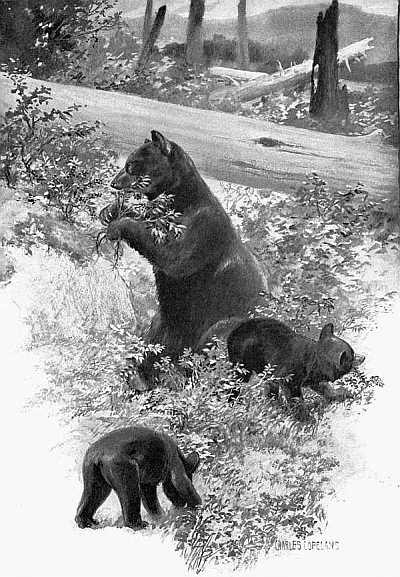The mother came out first and sagged away backwards down the tree, swinging her head from side to side to look down and see how far yet, in true bear fashion. The four little ones followed her, clawing and whining their way to the bottom—all but one, who when half-way down turned and jumped,[21] [23]landing on his mother's soft back to save himself trouble. Then she led the way to the doorway among the rocks, and the young followed in single file, winding about on her trail, stopping and sniffing when she did, and imitating her every action, just as young bear cubs do when roaming about the woods.
