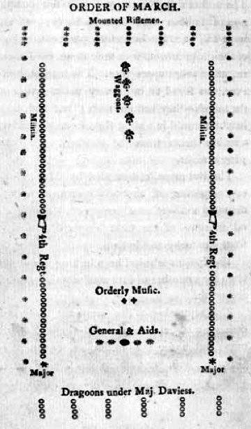 November 6.—When our spies, who had ventured near the Indian village, returned, and informed the Governor we were within a few miles of the Prophet's town—We were ordered to throw off our knapsacks, and be in preparation for an attack. We advanced about 4 miles to the edge of a piece of woods, when we were ordered to break off by companies, and advance in single lines; keeping a convenient distance from each other to enable us to form a line of battle, should necessity require it;—this was frequently done in the course of our advance toward the town, in consequence of the unevenness of the land, and the appearance of many favorable places for the enemy to attack us. In this manner we advanced very cautiously, until we came in sight of the Indian village, when we halted. The Indians appeared much surprized and terrified at our sudden appearance before their town; we perceived them running in every direction about the village, apparently in great confusion; their object however, was to regain in season their different positions behind a breastwork of logs which encircled the town from the bank of the Wabash. A chief came out to the Governor, begging of him not to proceed to open hostilities; but to encamp with the troops for that night, and in the morning they solemnly promised to come into camp and hold a council, and they would agree to almost any terms the Governor might propose; expressing their earnest desire for peace without bloodshed—but the treacherous villains merely made this promise to gain sufficient time to put their infernal scheme in execution. The Governor enquired of the chief where a situation suitable for encamping might be found; being informed, he dispatched three or four officers to examine the ground, who returned with a favorable report of the place—which was a piece of narrow rising ground, covered with heavy timber, running some length into a marshy prairie, and about three quarters of a mile north-west of the town. Here we encamped for the night, as near the form of a hollow square as the nature of the ground would admit. Being cool, cloudy weather, we built large fires in front of our tents, to dry our clothing, cook our provisions &c. The signal for the field officers to collect at the Governors marque was given; we were soon after ordered to lay with our cartridge boxes on, and our guns at our sides;—and in case of an attack, (as was always the order, while on the march,) each man stepped 5 paces in front of his tent, which formed the line of battle.