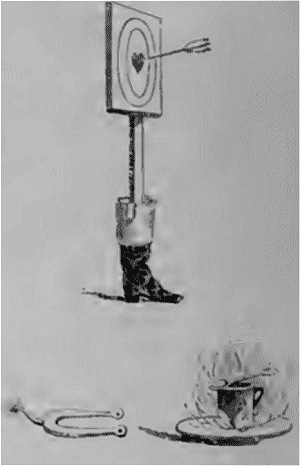 I. Placez devant vous un miroir plan MM', dans lequel vous apercevrez l'objet O que vous voulez atteindre. Mettez le canon du pistolet P sur l'épaule ou au-dessus, et dirigez-le, en regardant dans le miroir, et en visant, avec l'image P' du pistolet, l'image réfléchie O' du but à frapper; puis lâchez le coup lorsque l'image sera bien dans l'alignement de la mire et du canon.