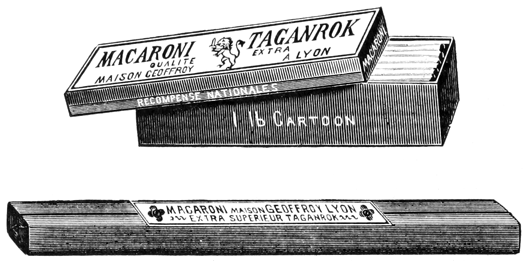 Break into three pieces, each tube of a half a pound of Geoffroy Taganrok Macaroni, which is the best in the market. Put it into a porcelain lined dish or saucepan, cover with boiling water, add a scant teaspoonful of table salt and boil fifteen minutes; drain, place the Macaroni on a hot platter, cover it with a Curry sauce made of J. P. Smith's Curry Powder, over this strew a liberal quantity of (J. P. S.) Italien Parmasan Cheese and serve.