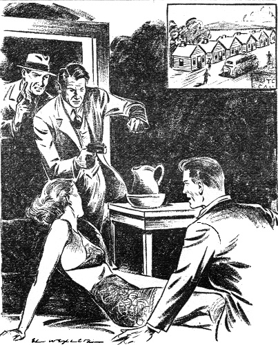 The man on the girl's right seemed to overlap her possessively which could have been accounted for by the width of his shoulders. His red hair bristled in defiance to any comb. His nose looked as though it had been hit a few times in its owner's lifetime. The greenish suit he wore was filled to capacity with overly developed muscles. A leather cased camera was suspended from his bull neck by means of a strap. He had a flashlight gun in his right hand, and a photographer's tripod was propped upright between his knees.