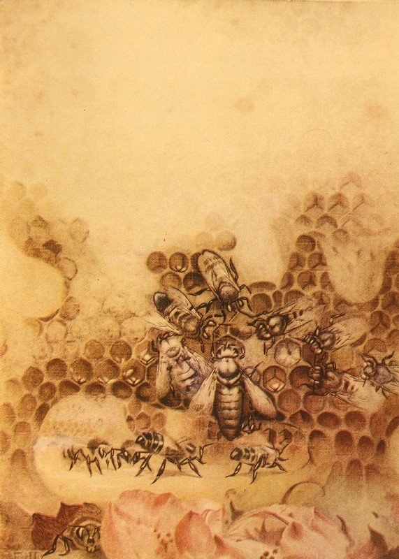 The spirit of the hive is prudent and wise, but never niggardly. In the glad summer days of sunshine and plenty it permits three or four hundred males to exist in the hive—pompous, useless, noisy creatures, who are greedy and dirty, vulgar and arrogant; but, one morning when the flowers are beginning to close earlier and open later, the spirit will quietly issue instructions that every male shall be killed. It draws up a sort of time-table for each one of the workers, allotting them tasks in accordance with their age; it selects the nurses who attend to the larvæ, and the ladies of honor who wait on the queen and never by any chance let her out of their sight. It has given the necessary orders to the house-bees who air and warm the hive by fanning their wings, thereby also helping the honey to settle; to the architects, masons, waxworkers and sculptors who form the mysterious curtain and build the combs; to the foragers who sally forth to the flowers in search of the nectar that turns into honey, of the pollen that feeds the larvæ, and of the water and salt required by the youth of the city.