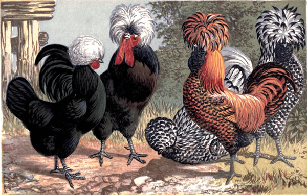 White-crested Black. Golden and Silver-spangled.This breed might with good reason be divided into more families, but it is usual to rank as Polands all fowls with their chief distinguishing characteristic, a full, large, round, compact tuft on the head. The breed "is quite unknown in Poland, and takes its name," says Mr. Dickson, "from some resemblance having been fancied between its tufted crest and the square-spreading crown of the feathered caps worn by the Polish soldiers." It is much esteemed in Egypt, and equally abundant at the Cape of Good Hope, where their legs are feathered. Some travellers assert that the Mexican poultry are crested, and that what are called Poland fowls are natives of either Mexico or South America; but others believe that they are natives of the East, and that they, as well as all the other fowls on the Continent of America, have been introduced from the Old World.