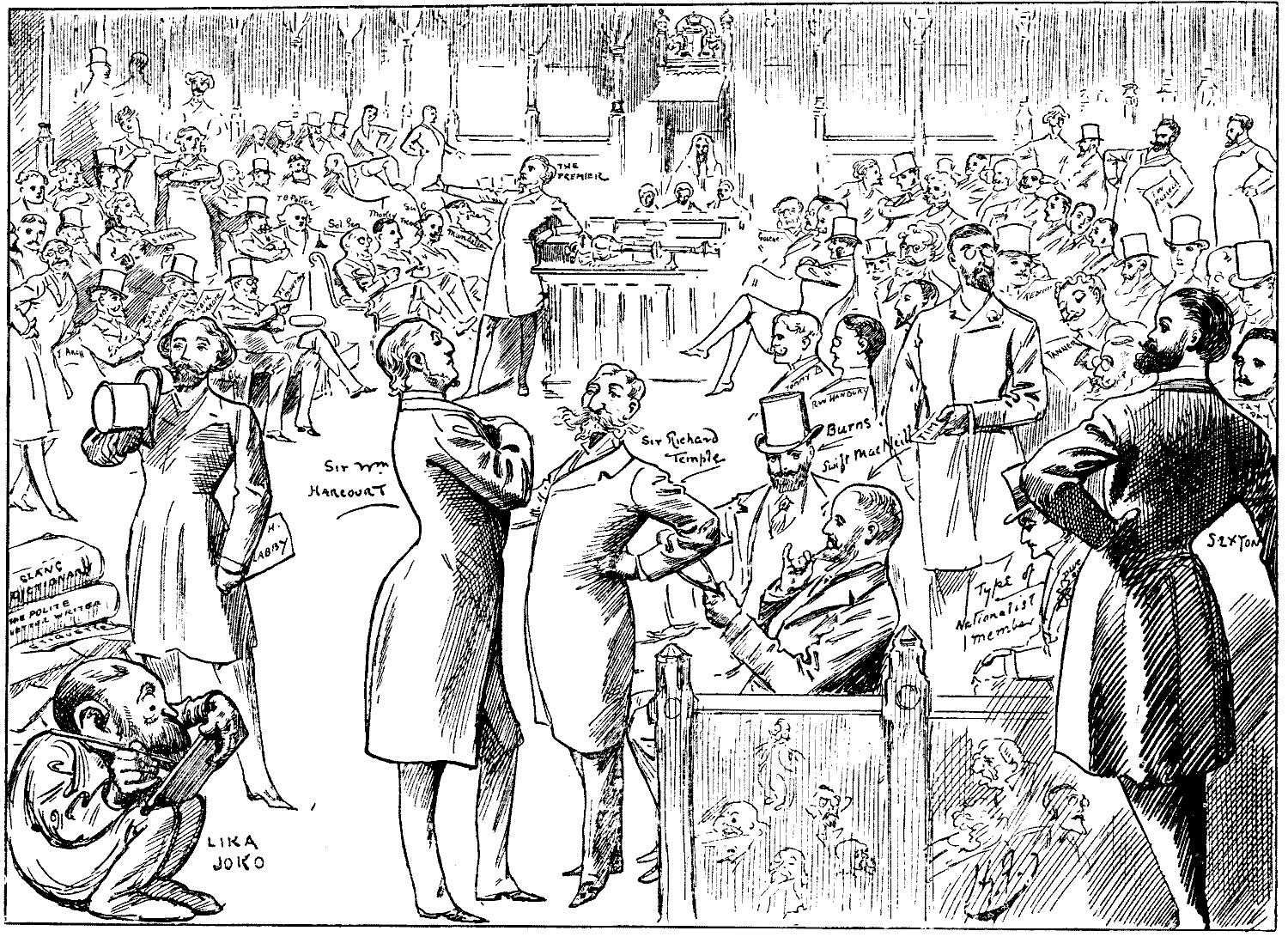 "Of course I was there, and voted in majority against Home-Rule Bill. Came down yesterday prepared to make most of this new and pleasant turn. Got up to ask Kimberley question as to whether postponement of Home-Rule Bill would date from Friday or Saturday. Nice point, you know. Everything depends upon it. No one had discovered point but me. Expected Government and House would be grateful. What happened? Kimberley snubbed me; House sniggered; my Woman's Suffrage Bill, about which Opposition Whips so anxious last week, treated with usual contumely. I propose to deal with Coal Strike; they move the Adjournment, and leave me speechless at the table. Begin to think that all they wanted was my vote to swell majority against Home-Rule Bill. A weary world, Toby. Saddest of all for neglected statesmen in our gilded Chamber. Should you ever be made a peer take an old man's advice and do everything you can to obscure your native abilities. Once you excite the jealousy of men like the Markiss, and implant in their bosom suspicion that if they don't look out you may supplant them, you are lost. Perhaps I made a mistake when I admitted Farmer-Atkinson to my councils. You remember him in the other House as Member for Boston? We had a plan——but no matter. Still, if Farmer-Atkinson had led the Commons and I the Lords, you would have seen something. Perhaps we were too reckless in our open colloguing in the Lobby. Gladstone smelt a rat. Salisbury saw it moving in the air; the instincts of self-preservation triumphed over political animosity and the rivalry of a lifetime. They put their heads together; the coffers of the secret-service money were depleted; the illimitable resources of the State were in other ways drawn upon. Where is Farmer-Atkinson now? I am left solitary and friendless. For a while the Unholy Alliance triumphs; but they will find they have not done with Denman yet."