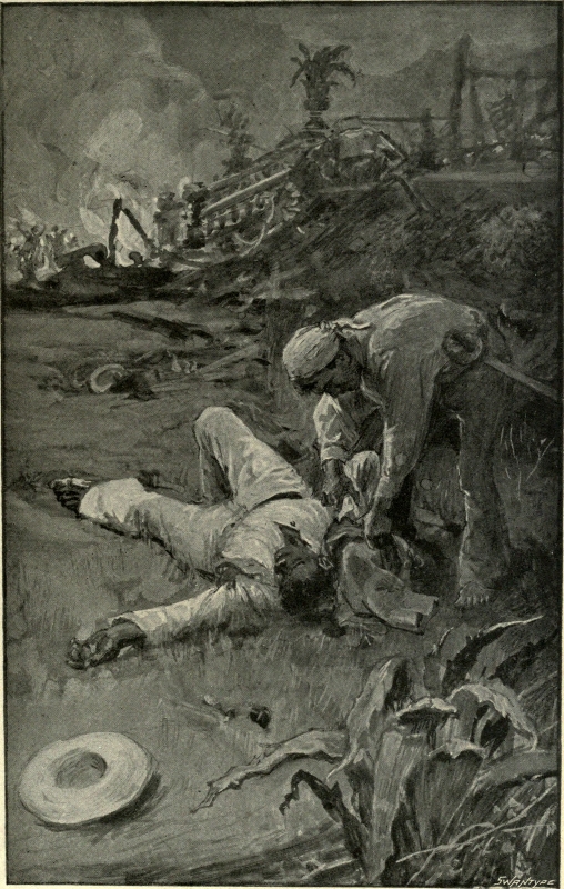 Nat made no effort to free himself, for he knew that were he to uncover his throat for a moment the dog would[Pg 10] seize him there. Though the pain was terrible he continued to deal stroke after stroke to the dog. One of these blows must have reached the heart, for suddenly its hold relaxed and it rolled over, just as half a dozen negroes armed with sticks came rushing out of the house. Nat tried to raise himself on his right arm, but the pain of the left was so great that he leant back again half-fainting. Presently he felt himself being lifted up and carried along; he heard a lady's voice giving directions, and then for a time he knew no more. When he came to himself he saw the ship's doctor leaning over him.