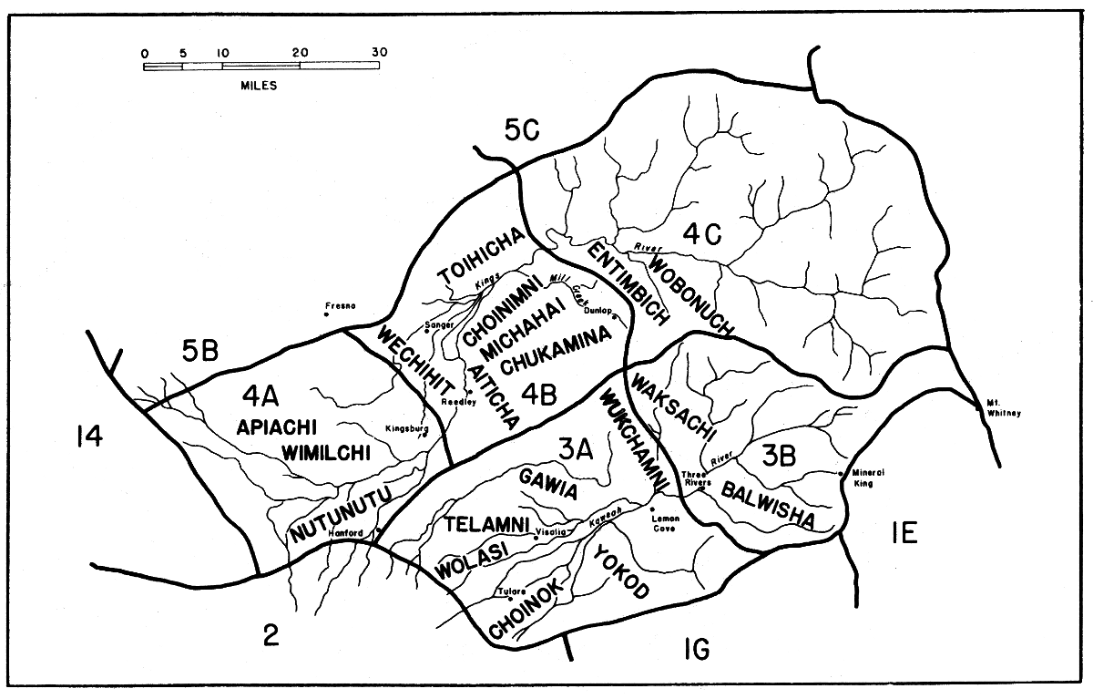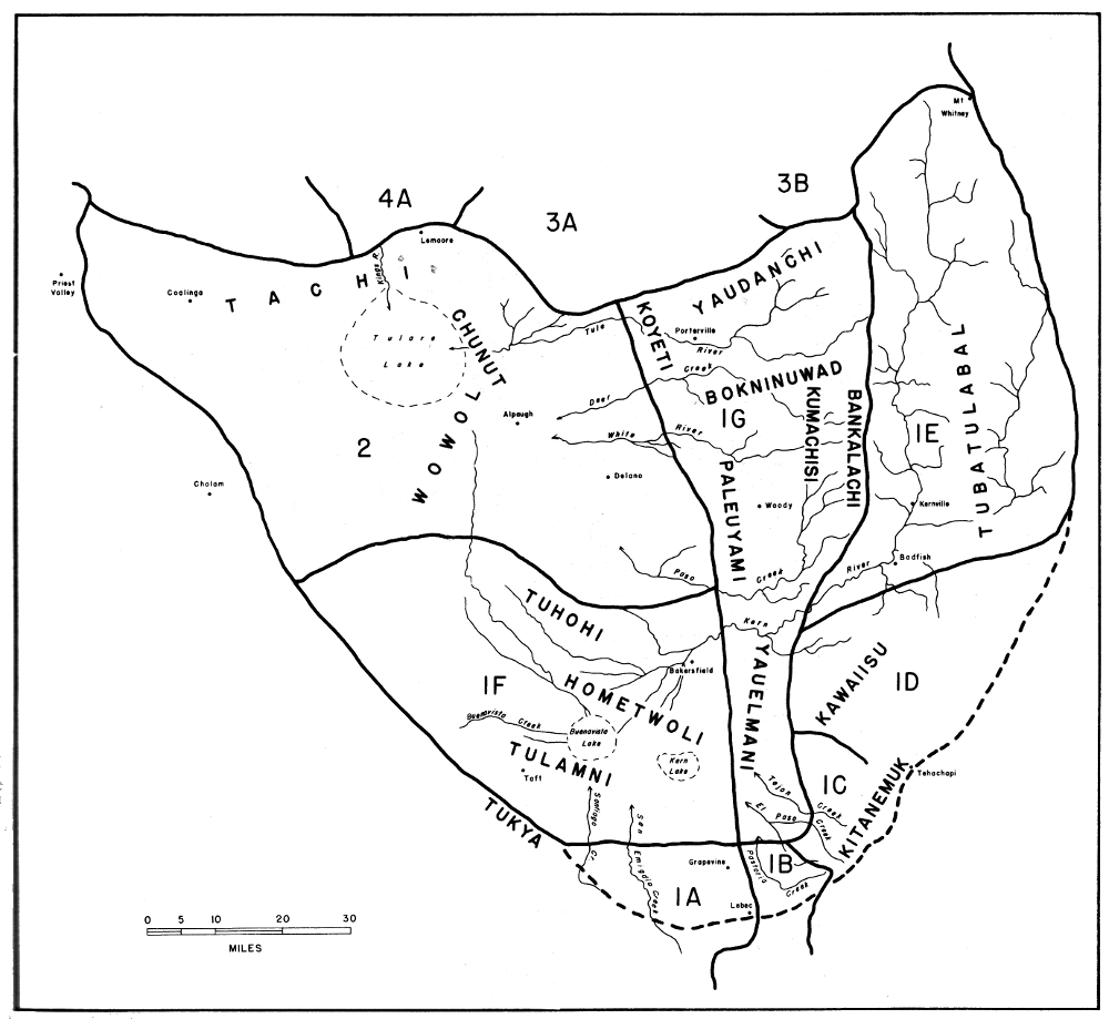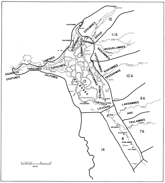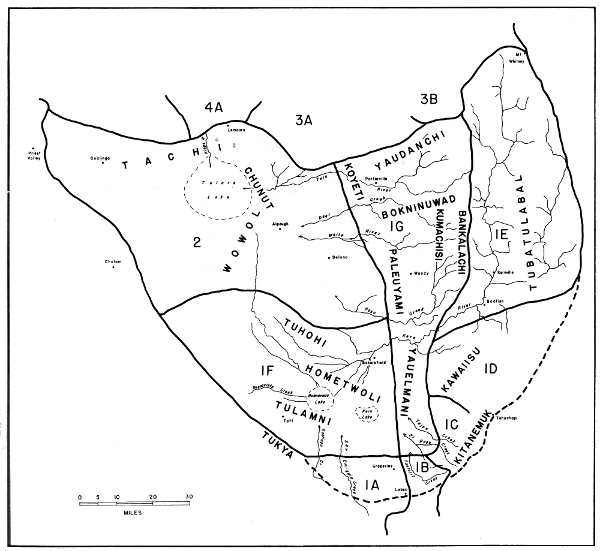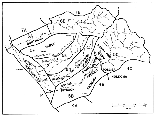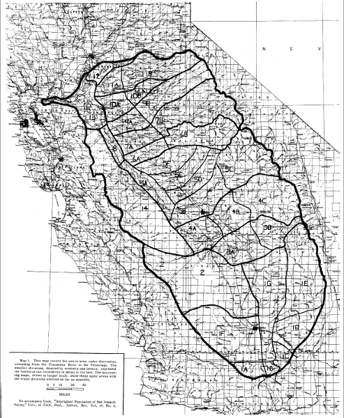 The region designated embraces the territory of the Plains and Sierra Miwok, the Yokuts, the Western Mono, the Tubatulabal, and the Kawaiisu. From the standpoint of habitat the area is diversified since it extends from the swampy valley floor through the oak country of the lower foothills into the transition life-zone of the middle altitudes. Perhaps an ecological segregation would be desirable. Such a procedure, however, would cut across tribal boundaries and make an accurate evaluation of population difficult. On the accompanying maps, areas are delineated, and numbered, primarily for convenience of reference. At the same time they conform as closely as is feasible with the natural subdivisions of the territory marked out by river valleys, lakes, plains, and mountains. It should be stressed that they do not necessarily coincide precisely with the areas occupied by specific tribes or groups of tribes.