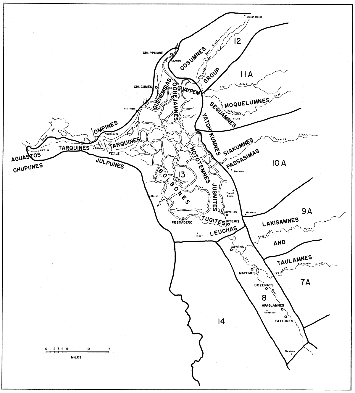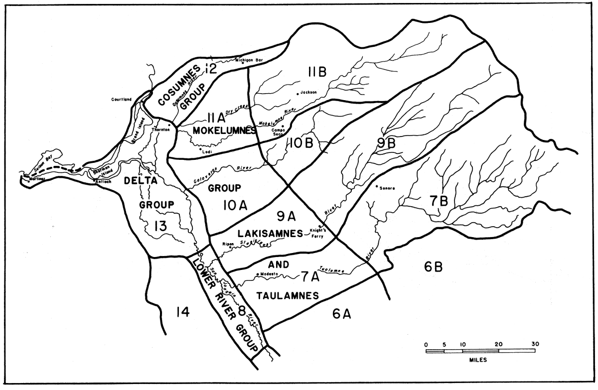 Further examination and correction are now in order. It will be noted that the estimates above do not include the area traversed by the Cosumnes, Mokelumne, and Calaveras rivers. Moreover, the federal agents confined their calculations to those natives who voluntarily or otherwise were incorporated in the local reservation system. That many Indians were overlooked, not only in the more remote foothills, but also in the valley itself cannot be doubted. In order to assess the population in greater detail as well as to introduce new sources of information it will be advantageous to break up the entire region into smaller units and consider these units one by one.