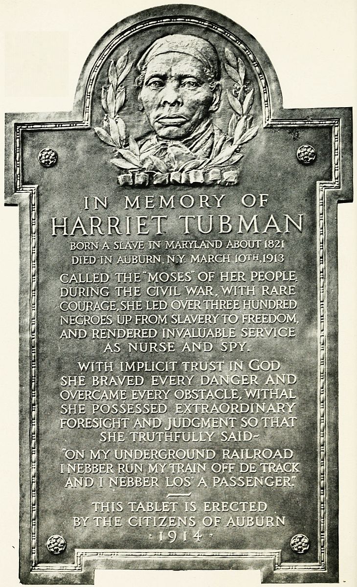 After the war Harriet Tubman made Auburn her home, establishing there a refuge for aged Negroes. She married again, so that she is sometimes referred to as Harriet Tubman Davis. She died at a very advanced age March 10, 1913. On Friday, June 12, 1914, a tablet in her honor was unveiled at the Auditorium in Albany. It was provided by the Cayuga County Historical Association, Dr. Booker T. Washington was the chief speaker of the occasion, and the ceremonies were attended by a great crowd of people.