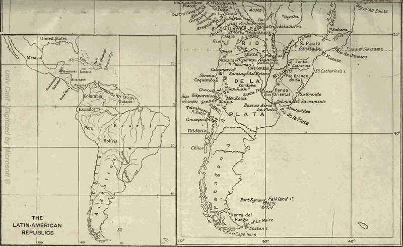 The map at the end of the book shows the former Spanish and Portuguese possessions in America, and also the existing Latin-American Republics.