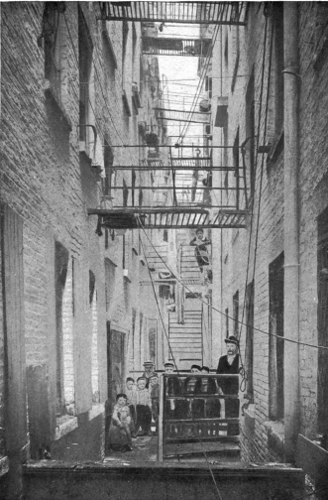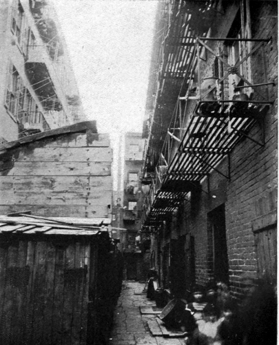 They were the worst as they were the first of New York's tenements. The double-deckers of which I have spoken had, with all their evils, at least this to their credit, that their death rate was not nearly as high as that of the old houses. That was not because of any virtue inherent in the double-deckers, but because the earlier tenements were old, and built in a day that knew nothing of sanitary restrictions, and cared less. Hence the showing that the big tenements had much the lowest mortality. The death rate does not sound the depths of tenement house evils, but it makes a record that is needed when it comes to attacking property rights. The mortality of the rear tenements had long been a scandal. They are built in the back yard, generally back to back with the rear buildings on abutting lots. If there is an open space between them, it is never more than a slit a foot or so wide, and gets[Pg 71] to be the receptacle of garbage and filth of every kind; so that any opening made in these walls for purposes of ventilation becomes a source of greater danger than if there were none. The last count that was made, in 1898, showed that among the 40,958 tenements in New York there were still 2379 rear houses left. Where they are the death rate rises, for reasons that are apparent. The sun cannot reach them. They are damp and dark, and the tenants, who are always the poorest and most crowded, live "as in a cage open only toward the front," said the Tenement House Committee. A canvass made of the mortality records by Dr. Roger S. Tracy, the registrar of records, showed that while in the First Ward (the oldest), for instance, the death rate in houses standing singly on the lot was 29.03 per 1000 of the living, where there were rear houses it rose to 61.97. The infant death rate is a still better test: that rose from 109.58 in the single tenements of the same ward to 204.54 where there were rear houses. One in every five babies had to die, that is to say; the house killed it. No wonder the committee styled the rear tenements "slaughter[Pg 72] houses," and called upon the legislature to root them out, and with them every old, ramshackle, disease-breeding tenement in the city.