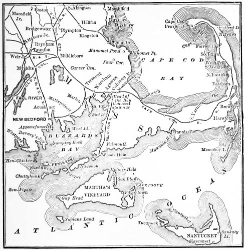 The old Voyagers again.—Derivation of the Name of Nantucket.—Sail from Wood's Hole to the Island.—Vineyard Sound.—Walks in Nantucket Streets.—Whales, Ships, and Whaling.—Nantucket in the Revolution.—Cruising for Whales.—The Camels.—Nantucket Sailors.—Loss of Ship Essex.—Town-crier.—Island History.—Quaker Sailors.—Thomas Mayhew.—Spermaceti.—Macy, Folger, Admiral Sir Isaac Coffin.
