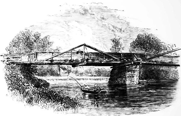 [303] The first bridge spanning what was known as Howland's Ferry was completed in 1795. It was of wood, destroyed and swept to sea by a storm; rebuilt, and again destroyed by worms. The present stone structure was built in 1809-'10, and, though injured by the gale of 1815, stands firm.