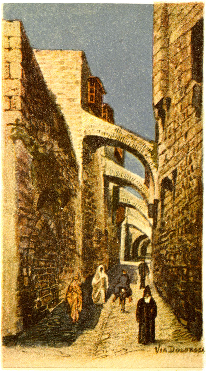Rondom haar heen, tegen de bergen, die haar insluiten, zien wij overal gebouwen en stichtingen der liefdadigheid, die de Christenen hier in het leven riepen. Hier de huizen der Duitsche kolonisten; daar Talitha Kûmi en het Syrische Weeshuis, de bekende toevluchtsoorden voor meisjes en jongens; ginds het groote hospitaal voor kranken en het Asyl voor melaatschen; voorts tal van pelgrimshuizen van Duitschen, Franschen en Russen, die als een groot leger de stad omringen, alsof zij door de macht der liefde haar wilden veroveren voor Hem, die Liefde is en dien zij allen belijden als den Heiland en Zaligmaker der wereld. Zonder zich hunner belijdenis te schamen, stellen zij haar echter niet op den voorgrond; het is alsof zij zich hier allen getooid hebben in het kleed der dienende liefde als de band der volmaaktheid, die hen samen verbindt. Zij liggen daar als stille getuigen van de ontfermende liefde en trouw van Hem, die bij zijn laatste afscheid aan de Zijnen beval „te beginnen van Jerusalem”.