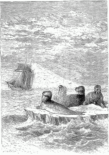 The next day the huge, human-faced walrus came quite near the brig in great numbers, shaking their grim, dripping fronts. The dovekies, more cheerful visitors, scud past toward the land. Both walrus and fowls proclaimed in their way the terribleness of the increasing tempest. The place of the broken hawser had been supplied, and the worried craft strained away at three strong lines which held on bravely. Everything on board was stowed[18] away, or lashed securely, which could invite an assault by the wind.