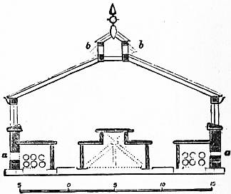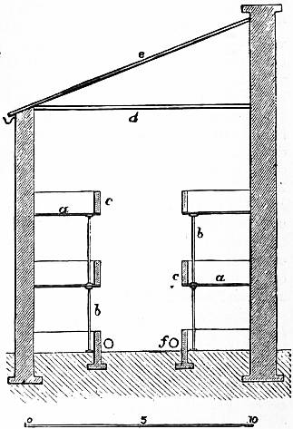 Plant Houses.—These include all those structures which are more intimately associated with the growth of ornamental plants and flowers, and comprise conservatory, plant stove, greenhouse and the subsidiary pits and frames. They should be so erected as to present the smallest extent of opaque surface consistent with stability. With this object in view, the early improvers of hot-house architecture substituted metal for wood in the construction of the roofs, and for the most part dispensed with back walls; but the conducting power of the metal caused a great irregularity of temperature, which it was found difficult to control; and, notwithstanding the elegance of metallic houses, this circumstance, together with their greater cost, has induced most recent authorities to give the preference to wood. The combination of the two, however, shows clearly that, without much variation of heat or loss of light, any extent of space may be covered, and houses of any altitude constructed.