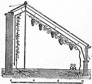 Plant houses constructed of the best Baltic pine timber are very durable, but the whole of the parts should be kept as light as possible. In many houses, especially those where ornament is of no consequence, the rafters are now omitted, or only used at wide intervals, somewhat stouter sash-bars being adopted, and stout panes of glass (usually called 21-oz.) 12 to 18 in. wide, made use of. Such houses are very light; being also very close, they require careful ventilation. The glass roof is commonly designed so as to form a uniform plane or slope from back to front in lean-to houses (fig. 2), and from centre to sides in span-roofed houses. To secure the greatest possible influx of light, some horticulturists recommend curvilinear roofs; but the superiority of these is largely due to the absence of rafters, which may also be dispensed with in plain roofs. They are very expensive to build and maintain. Span and ridge-and-furrow roofs, the forms now mostly preferred, are exceedingly well adapted for the admission of light, especially when they are glazed to within a few inches 749 of the ground. They can be made, too, to cover in any extent of area without sustaining walls. Indeed, it has been proposed to support such roofs to a great extent upon suspension principles, the internal columns of support being utilized for conducting the rain-water off the roof to underground drains or reservoirs. The lean-to is the least desirable form, since it scarcely admits of elegance of design, but it is necessarily adopted in many cases.