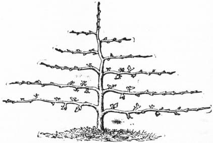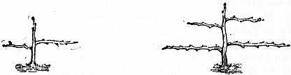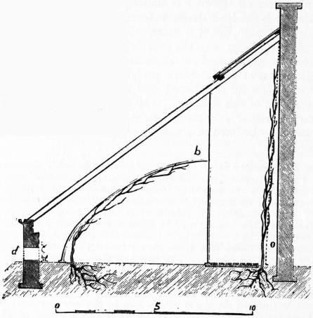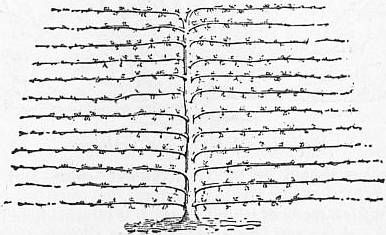 Espalier Rails.—Subsidiary to walls as a means of training fruit trees, espalier rails were formerly much employed, and are still used in many gardens. In their simplest form, they are merely a row of slender stakes of larch or other wood driven into the ground, and connected by a slight rod or fillet at top. The use of iron rails has now been almost wholly discontinued on account of metallic substances acting as powerful conductors of both heat and cold in equal extremes. Standards from which galvanized wire is tightly strained from one end to the other are preferable and very convenient. Trees trained to them are easily got at for all cultural operations, space is saved, and the fruit, while freely exposed to sun and air, is tolerably secure against wind. They form, moreover, neat enclosures for the vegetable quarters, and, provided excess of growth from the centre is successfully grappled with, they are productive in soils and situations which are suitable.