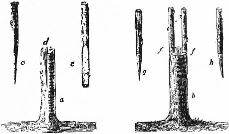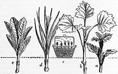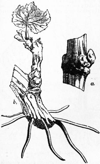 Propagation by Buds.—The detached leaf-buds (gemmae or bulbils), of some plants are capable under favourable conditions of forming new plants. The edges of the leaves of Bryophyllum calycinum and of Cardamine pratensis, and the growths in the axils of the leaves of Lilium bulbiferum, as well as the fronds of certain ferns (e.g. Asplenium bulbiferum), produce buds of this character. It is a matter of familiar observation that the ends of the shoots of brambles take root when bent down to the ground. In some instances buds form on the roots, and may be used for purposes of propagation, as in the Japan quince, the globe thistle, the sea holly, some sea lavenders, Bocconia, Acanthus, &c. Of the tendency in buds to assume an independent existence gardeners avail themselves in the operations of striking “cuttings,” and making “layers” and “pipings,” as also in budding and grafting. In taking a slip or cutting the gardener removes from the parent plant a shoot having one or more buds or “eyes,” in the case of the vine one only, and places it in a moist and sufficiently warm situation, where, as previously mentioned, undue evaporation from the surface is prevented. For some cuttings, pots filled with light soil, with the protection of the propagating-house and of bell-glasses, are requisite; but for many of our hardy deciduous trees and shrubs no such precautions are necessary, and the insertion of a short shoot about half its length into moist and gritty ground at the proper season suffices to ensure its growth. In the case of the more delicate plants, the formation of roots is preceded by the production from the cambium of the cuttings of a succulent mass of tissue, the callus. It is important in some cases, e.g. zonal pelargoniums, fuchsias, shrubby calceolarias, dahlias, carnations, &c., to retain on the cutting some of its leaves, so as to supply the requisite food for storage in the callus. In other cases, where the buds themselves contain a sufficiency of nutritive matter for the young growths, the retention of leaves is not necessary. The most successful mode of forming roots is to place the cuttings in a mild bottom-heat, which expedites their growth, even in the case of many hardy plants whose cuttings strike roots in the open soil. With some hard-wooded trees, as the common white-thorn, roots cannot be obtained without bottom-heat. It is a general rule throughout plant culture that the activity of the roots shall be in advance of that of the leaves. Cuttings of deciduous trees and shrubs succeed best if planted early in autumn while the soil still retains the solar heat absorbed during summer. For evergreens August or September, and for greenhouse and stove-plants the spring and summer months, are the times most suitable for propagation by cuttings.
