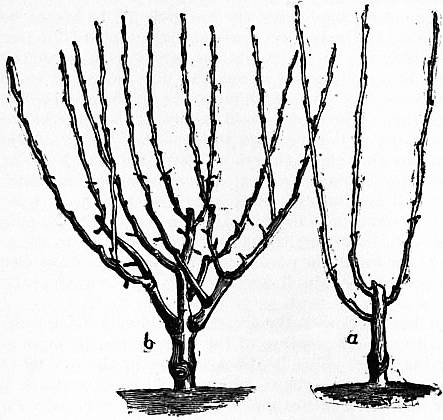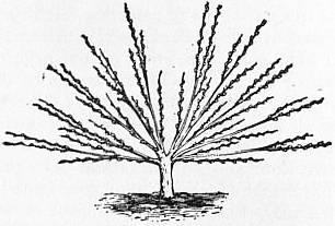 Buds.—The recognition of the various forms of buds and their modes of disposition in different plants is a matter of the first consequence in the operations of pruning and training. Flower-buds are produced either on the old wood, i.e. the shoots of the past year’s growth, or on a shoot of the present year. The peach, horse-chestnut, lilac, morello cherry, black currant, rhododendron and many other trees and shrubs develop flower-buds for the next season speedily after blossoming, and these may be stimulated into premature growth. The peculiar short, stunted branches or “spurs” which bear the flower-buds of the pear, apple, plum, sweet cherry, red currant, laburnum, &c., deserve special attention. In the rose, passion-flower, clematis, honeysuckle, &c., in which the flower-buds are developed at the ends of the young shoot of the year, we have examples of plants destitute of flower-buds during the winter.