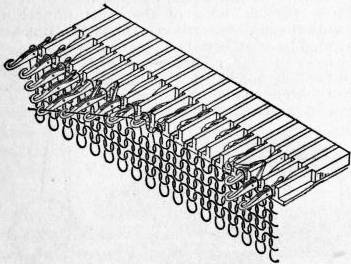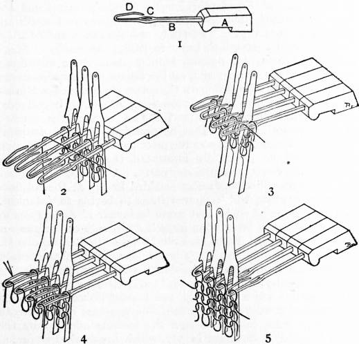 HUCKABACK,1 the name given to a type of cloth used for towels. For this purpose it has perhaps been more extensively used in the linen trade than any other weave. One of the chief merits of a towel is its capacity for absorbing moisture; plain and other flat-surfaced cloths do not perform this function satisfactorily, but cloths made with huckaback, as well as those made with the honeycomb and similar weaves, are particularly well adapted for this purpose. The body or foundation of the cloth is plain and therefore sound in structure (see designs A and B in figure), but at fixed intervals some of the warp threads float on the surface of the cloth, while at the same time a number of weft threads float on the back. Thus the cloth has a somewhat similar appearance on both sides. Weave A is the ordinary and most used huck or huckaback, while weave B, which is usually woven with double weft, is termed the Devon or medical huck. The cloths made by the use of these weaves were originally all linen, but are too often adulterated with inferior fibres.
