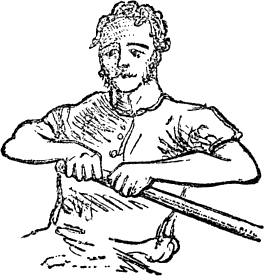 De roeiers zien met voorovergebogen lichaam en gestrekte armen recht voor zich uit en hebben slechts op den slag te letten om tegelijk met hem te kunnen beginnen. Daartoe houden zij dan ook voortdurend het blad van den riem in het water.